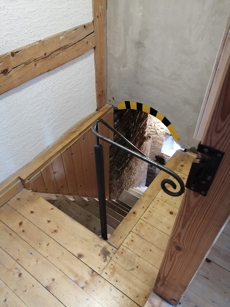 Der hohe Treppenturm trägt in 26 Meter Höhe über einem Rundbogenfries einen spitzen Dachhelm. Unter diesem öffnet sich neben dem letzten Zugang zum Hauptturm die Tür des Wachttürmchens, in dem man auf Sandsteinstufen um eine runde Spindel herum zur Türmerwohnung gelangt.