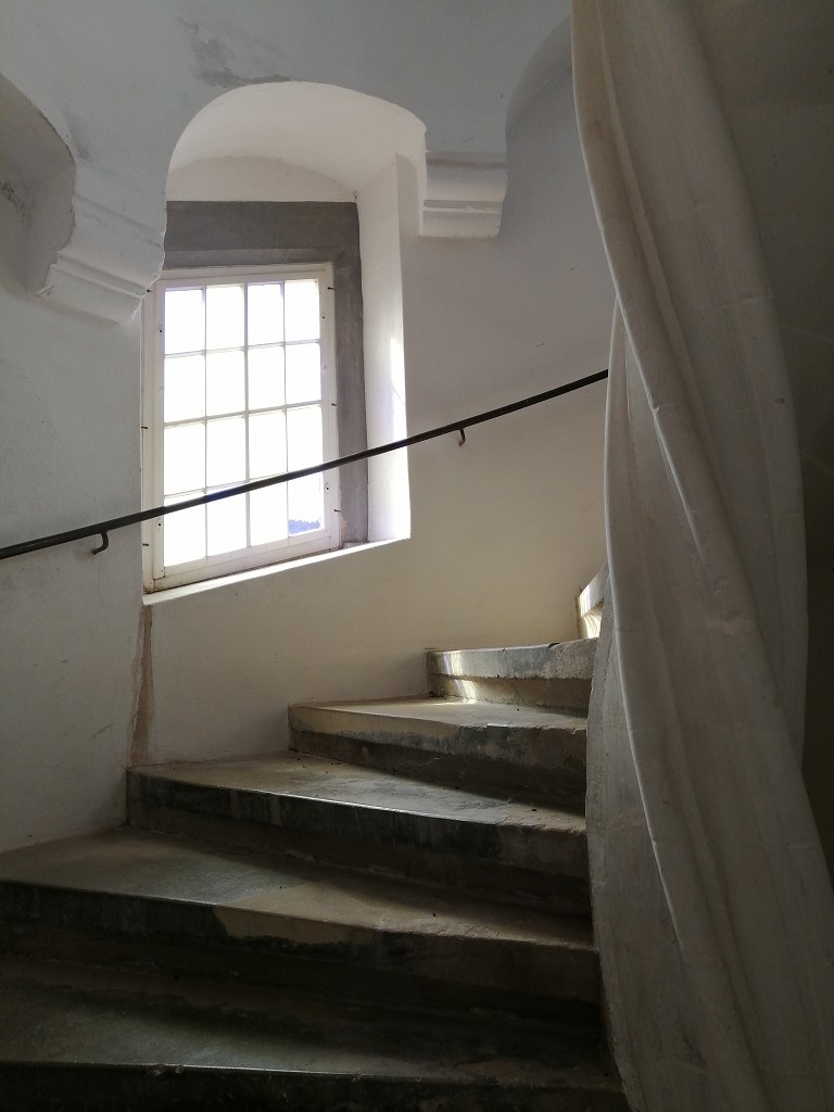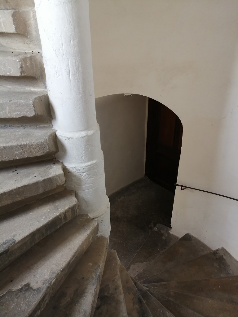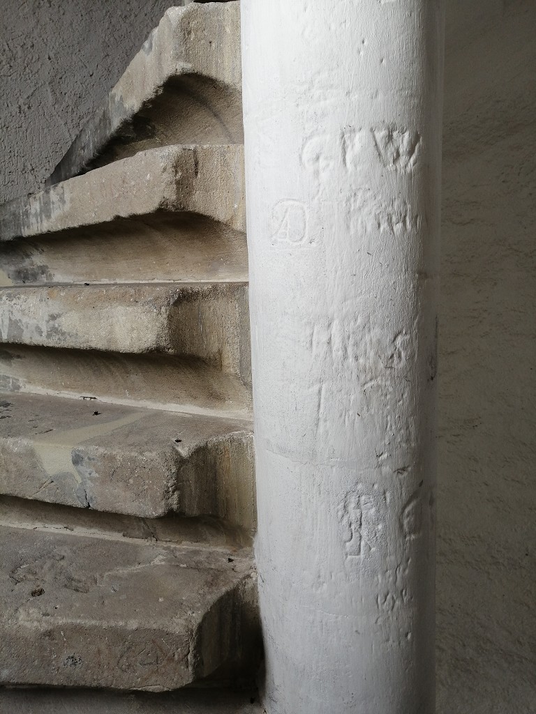 Darüber hinaus zeigt sie eine glatte, runde Form. In beiden Teilen weist die Spindel 19 Steinmetzzeichen auf. Einem wurde die Jahreszahl 1560 beigefügt.