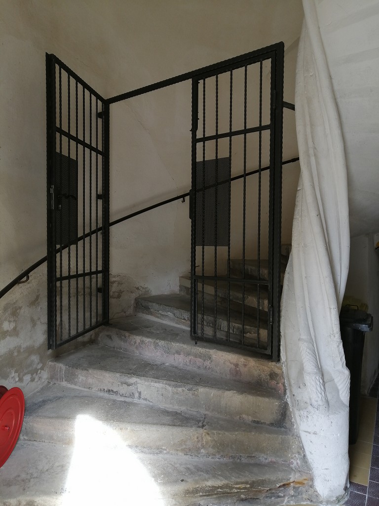 Der hohe Treppenturm weist eine Wendeltreppe mit 2,40 Meter langen Sandsteinstufen auf, die zu den Eingängen der Geschosse III bis VI des Hauptturms und vom vierten Geschoß an zu den Türen der vier Böden des hohen und langen Dachstuhls der Kirche führen. Die spätgotische Spindel der Wendeltreppe ist bis zur Höhe der Emporen gedreht und durch zwei Rundstäbe und Hohlkehlen profiliert.